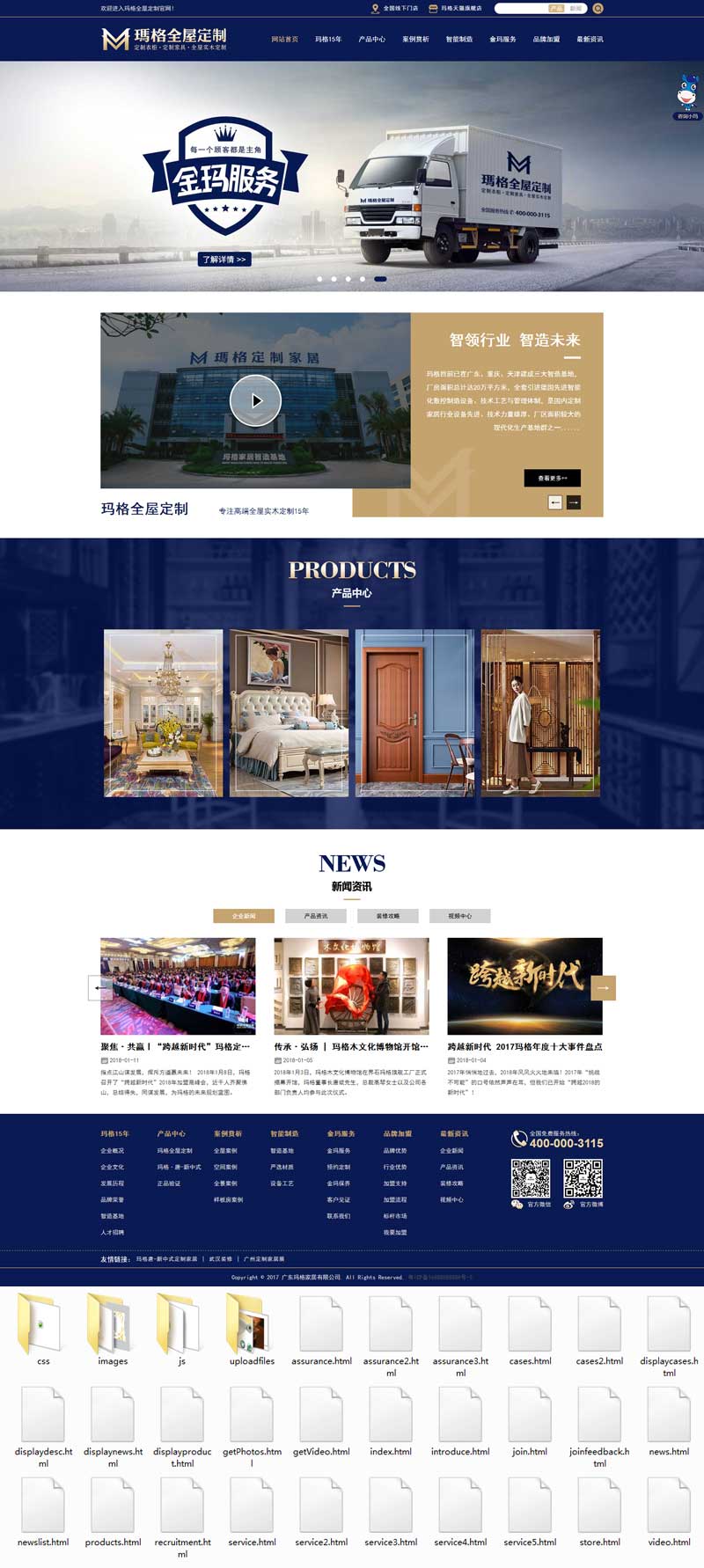 蓝色大气的家居公司,专注全屋实木定制,致力于为客户提供专业化的全屋定制家居解决方案与服务。实木家具行业网站模板html整站下载。玛格15年、产品中心、案例赏析、智能制造、金玛服务、品牌加盟、最新资讯总共7个页面模块。