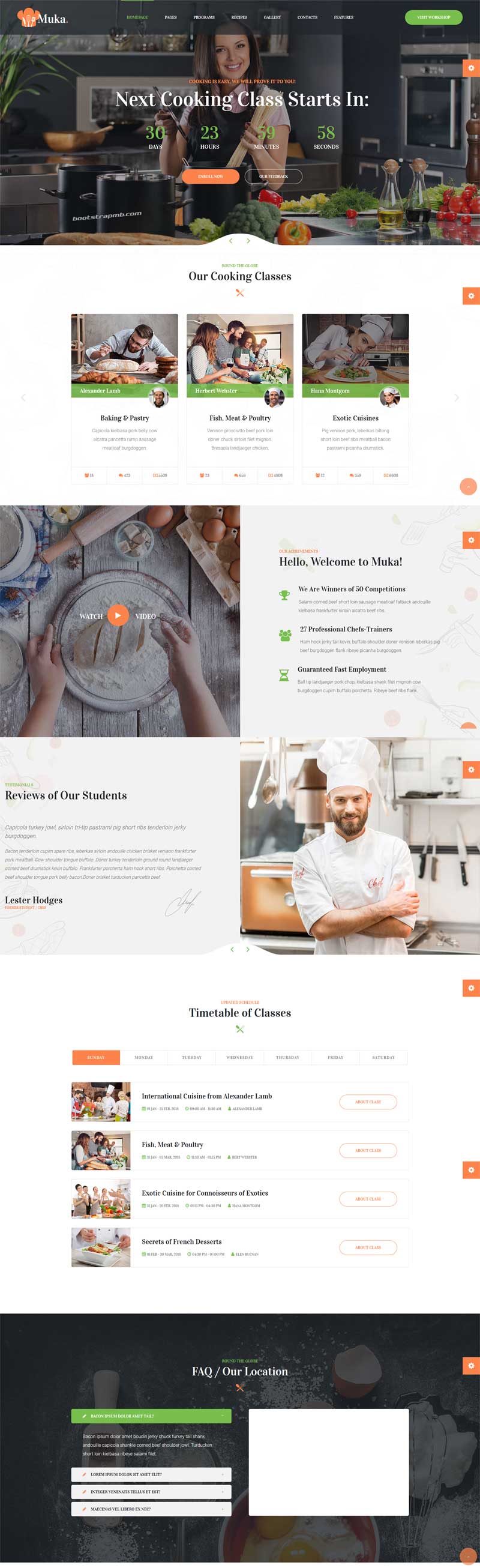 一款基于Bootstrap框架构造,绿色大气的美食菜谱在线学习网站HTML模板。适用于:烹饪学习,烹饪课程和研讨会,烘焙糕点教训,烹饪培训的网络教育。或者食物,咖啡馆,面包店,烹饪相关的网站。