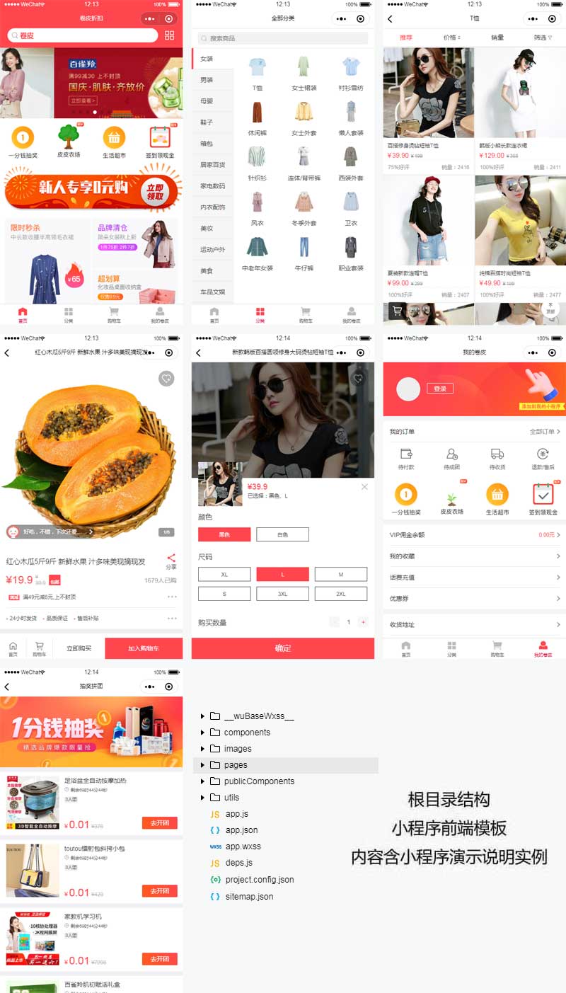 红色的卷皮折扣电商app小程序,综合生活购物商城app小程序前端模板下载。包含:首页、分类、购物车、列表、商品详情、个人中心、优惠券、全部订单、生活超市专题等等。一套很全通用的商城app小程序模板。