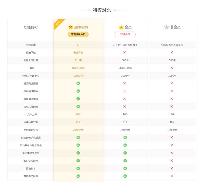 <div class="module-line"> <span class="arrow left-arrow"></span> <span class="text">特权对比</span> <span class="arrow right-arrow"></span> </div> <div class="module-privilege"> <ul class="privilege-ul name-ul"> <li class="privilege-item first-item"> <p class="title"> <span>功能特权</span> </p> </li> <li class="privilege-item" style="background: #fbf9f8"> <a>空间容量</a> </li> <li class="privilege-item"> <a>极速下载</a> </li> <li class="privilege-item" style="background: #fbf9f8"> <a>批量上传数量</a> </li> <li class="privilege-item"> <a>云解压</a> </li> <li class="privilege-item" style="background: #fbf9f8"> <a>转存文件数上限</a> </li> <li class="privilege-item"> <a>视频高速通道</a> </li> <li class="privilege-item"> <a>视频倍速播放</a> </li> <li class="privilege-item"> <a>音频倍速播放</a> </li> <li class="privilege-item" style="background: #fbf9f8"> <a>垃圾文件清理</a> </li> <li class="privilege-item"> <a>大文件上传</a> </li> <li class="privilege-item" style="background: #fbf9f8"> <a>回收站有效期</a> </li> <li class="privilege-item"> <a>照片电影特权</a> </li> <li class="privilege-item" style="background: #fbf9f8"> <a>自动备份手机视频</a> </li> <li class="privilege-item"> <a>自动备份本地文件夹</a> </li> <li class="privilege-item" style="background: #fbf9f8"> <a>备份本地文件夹</a> </li> <li class="privilege-item"> <a>备份实况照片</a> </li> <li class="privilege-item" style="background: #fbf9f8"> <a>历史版本</a> </li> <li class="privilege-item"> <a>尊贵身份标识</a> </li> </ul> <ul class="privilege-ul svip-ul active recommend"> <li class="privilege-item first-item"> <div class="svip-type"> <p class="vip-type-icon"> <span class="vip-icon svip-middle icon-size-middle"></span> </p> <span class="vip-type-title">超级会员</span> </div> <div class="buy-btn-box"> <p class="center-button-base center-button-light-yellow center-button-container-middle">开通超级会员 </p> </div> </li> <li class="privilege-item" style="background: #fbf4e4">5T</li> <li class="privilege-item">极速下载</li> <li class="privilege-item" style="background: #fbf4e4">无上限</li> <li class="privilege-item">4G内压缩包</li> <li class="privilege-item" style="background: #fbf4e4">50000个</li> <li class="privilege-item"><span class="icon right"></span></li> <li class="privilege-item"><span class="icon right"></span></li> <li class="privilege-item"><span class="icon right"></span></li> <li class="privilege-item" style="background: #fbf4e4"><span class="icon right"></span></li> <li class="privilege-item">20G</li> <li class="privilege-item" style="background: #fbf4e4">30天</li> <li class="privilege-item">20张照片</li> <li class="privilege-item" style="background: #fbf4e4"><span class="icon right"></span></li> <li class="privilege-item"><span class="icon right"></span></li> <li class="privilege-item" style="background: #fbf4e4"><span class="icon right"></span></li> <li class="privilege-item"><span class="icon right"></span></li> <li class="privilege-item" style="background: #fbf4e4"><span class="icon right"></span></li> <li class="privilege-item last-item"><span class="icon right"></span></li> </ul> <ul class="privilege-ul vip-ul "> <li class="privilege-item first-item"> <div class="vip-type"> <p class="vip-type-icon"> <span class="vip-icon vip-middle icon-size-middle"></span> </p> <span class="vip-type-title">会员</span> </div> <div class="buy-btn-box"> <p class="center-button-base center-button-light-red center-button-container-middle">开通会员 </p> </div> </li> <li class="privilege-item" style="background: #fbf9f8">2T(免任务扩容至2T)</li> <li class="privilege-item"><span class="icon error"></span></li> <li class="privilege-item" style="background: #fbf9f8">500个</li> <li class="privilege-item">2G内压缩包</li> <li class="privilege-item" style="background: #fbf9f8">3000个</li> <li class="privilege-item"><span class="icon error"></span></li> <li class="privilege-item"><span class="icon error"></span></li> <li class="privilege-item"><span class="icon error"></span></li> <li class="privilege-item" style="background: #fbf9f8"><span class="icon error"></span></li> <li class="privilege-item">10G</li> <li class="privilege-item" style="background: #fbf9f8">15天</li> <li class="privilege-item">12张照片</li> <li class="privilege-item" style="background: #fbf9f8"><span class="icon right"></span></li> <li class="privilege-item"><span class="icon right"></span></li> <li class="privilege-item" style="background: #fbf9f8"><span class="icon right"></span></li> <li class="privilege-item"><span class="icon right"></span></li> <li class="privilege-item" style="background: #fbf9f8"><span class="icon right"></span></li> <li class="privilege-item"><span class="icon right"></span></li> </ul> <ul class="privilege-ul no-vip-ul"> <li class="privilege-item first-item"> <div class="no-vip-type"> <p class="vip-type-icon"> <span class="vip-icon no-vip-middle icon-size-middle"></span> </p> <span class="vip-type-title">非会员</span> </div> </li> <li class="privilege-item" style="background: #fbf9f8">完成任务后扩容至2T</li> <li class="privilege-item"><span class="icon error"></span></li> <li class="privilege-item" style="background: #fbf9f8">500个</li> <li class="privilege-item"><span class="icon error"></span></li> <li class="privilege-item" style="background: #fbf9f8">1000个</li> <li class="privilege-item"><span class="icon error"></span></li> <li class="privilege-item"><span class="icon error"></span></li> <li class="privilege-item"><span class="icon error"></span></li> <li class="privilege-item" style="background: #fbf9f8"><span class="icon error"></span></li> <li class="privilege-item">4G</li> <li class="privilege-item" style="background: #fbf9f8">10天</li> <li class="privilege-item">12张照片</li> <li class="privilege-item" style="background: #fbf9f8"><span class="icon error"></span></li> <li 