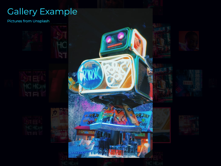 这是一款创意设计的图片排版模板示例,炫酷图片闪烁动态特效,点击悬停选中的图片可实现放大查看的动画效果,滚轮无限翻转,闪屏特效,精简易用。