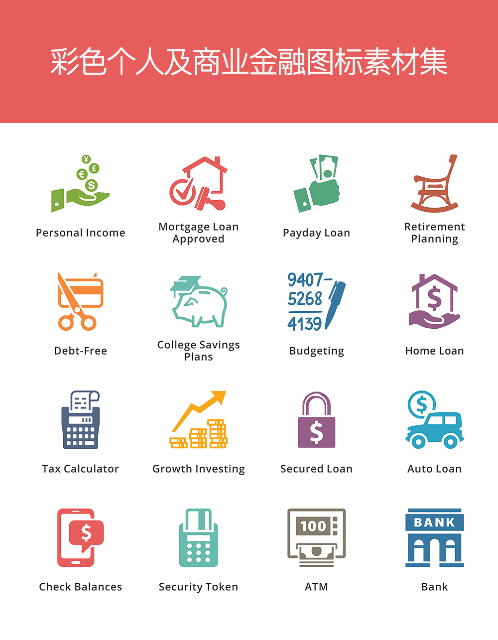 彩色个人及商业金融图标素材集,该套装包含16个个人和企业财务图标,可用于设计和开发网站,以及印刷材料和演示文稿。图标格式以及尺寸:两个不同的版本;完全可编辑的EPS和AI文件;透明PNG文件 - 256×256像素;SVG文件 - 256x256像素。本套图标包含了:商业,银行,金融,钱,收入,退休,贷款,债务,付款,抵押,储,投资,利润,税,预算等。