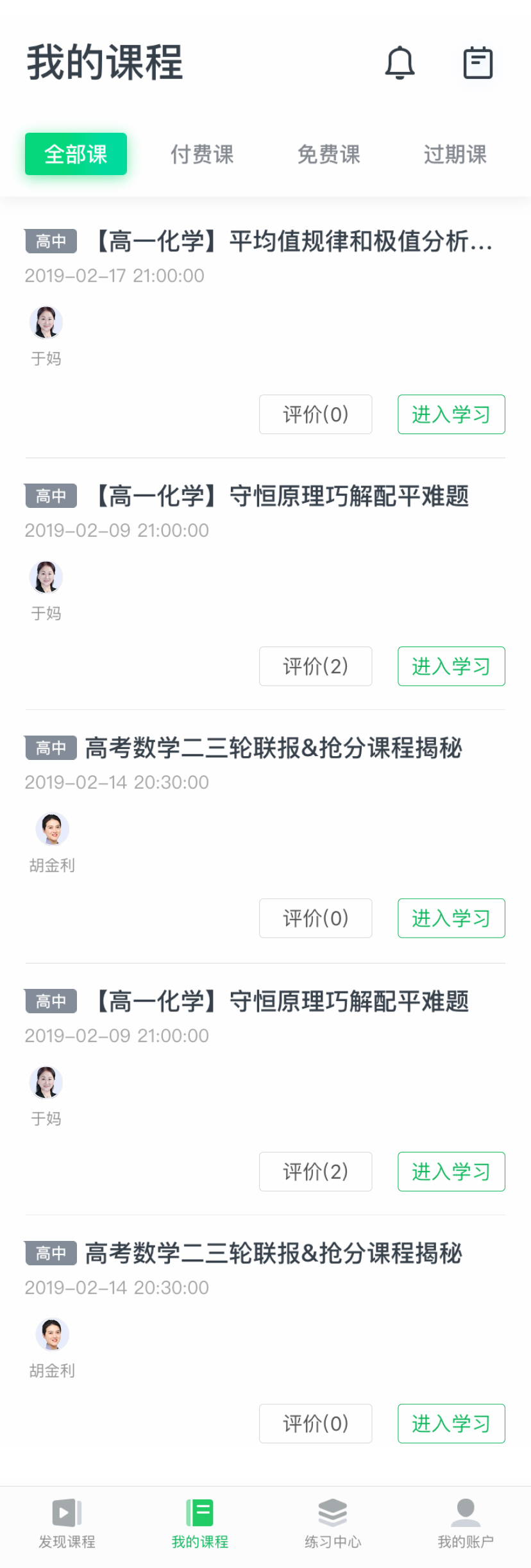 手机app在线学习我的课程学习列表页面模板。全部课、付费课、免费课、过期课tab页面切换。