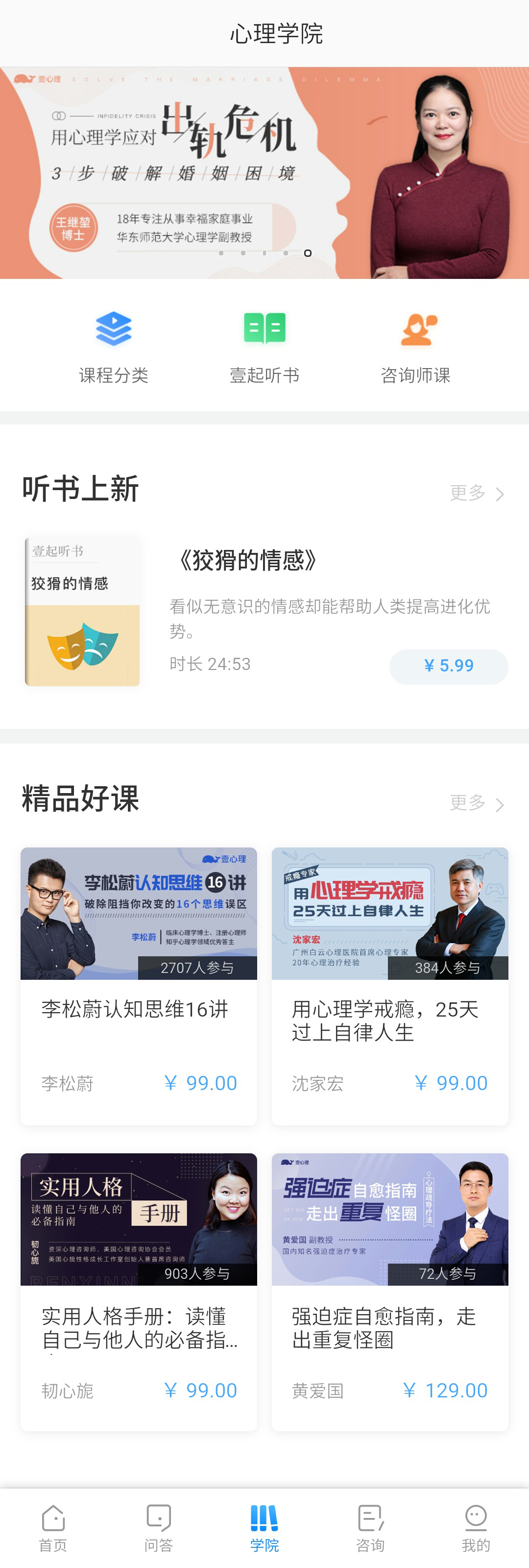 心理学院在线课程手机app页面模板。课程分类、壹起听书、咨询师课、听书上线、精品好课等。