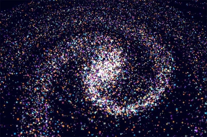 html5基于WebGL绘制彩色3D的银河系密集的星云旋转动画特效。