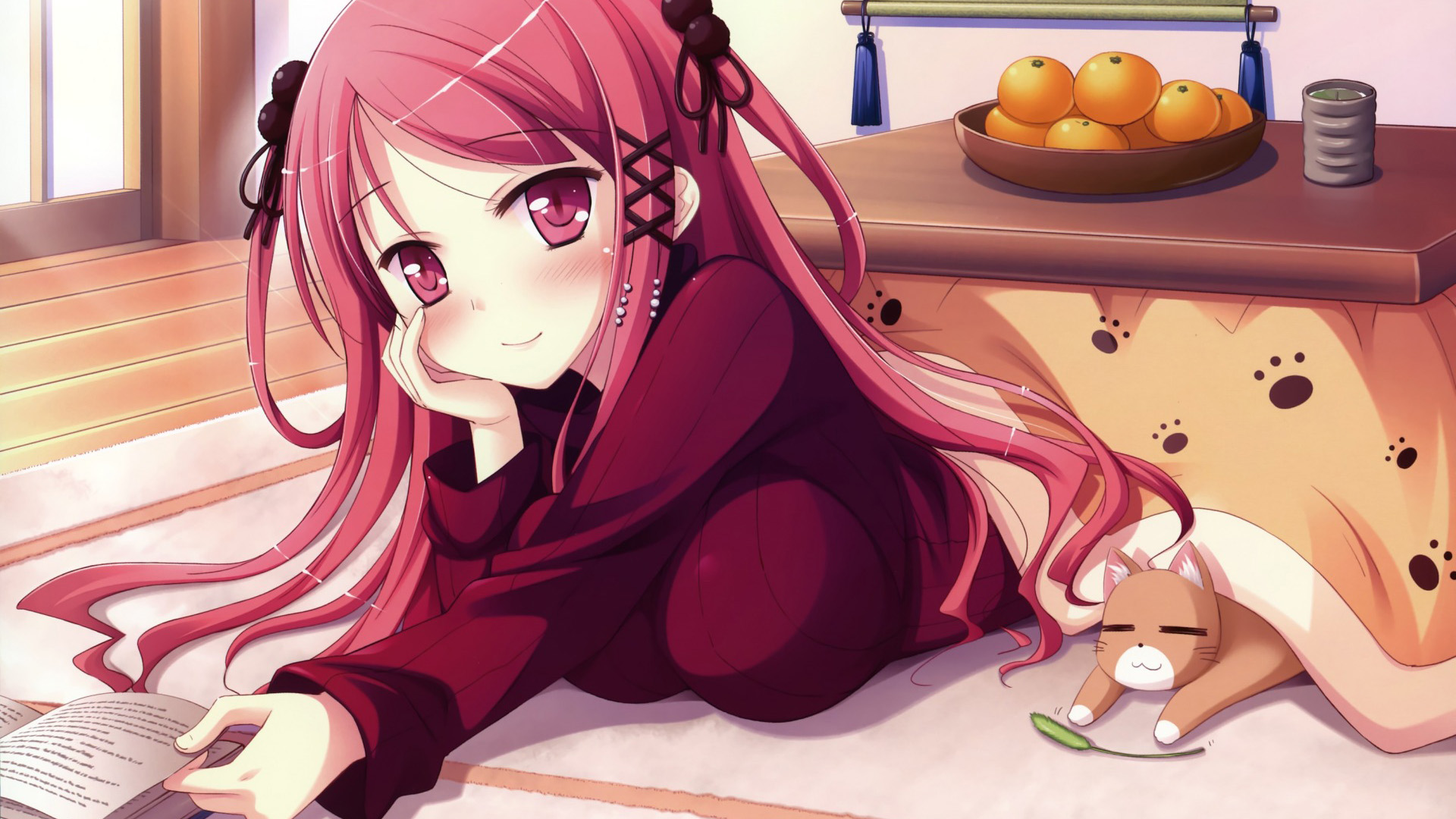 幻想曲动漫美少女,红眼长发女孩躺床持酒杯与小猫的免费电脑壁纸下载
