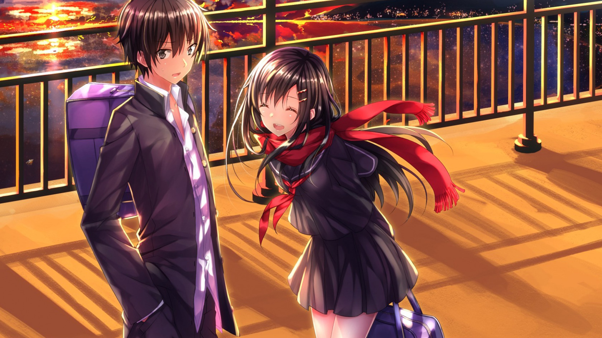 城市桥畔男女与武士刀精美动漫场景电脑壁纸免费下载