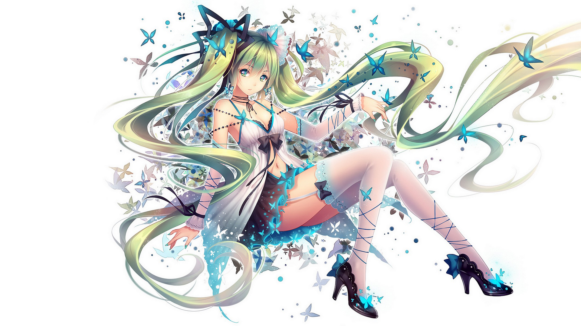 绿色眼睛女孩汽车主题动漫壁纸 白色短衬衫黑色裤袜免费电脑壁纸下载