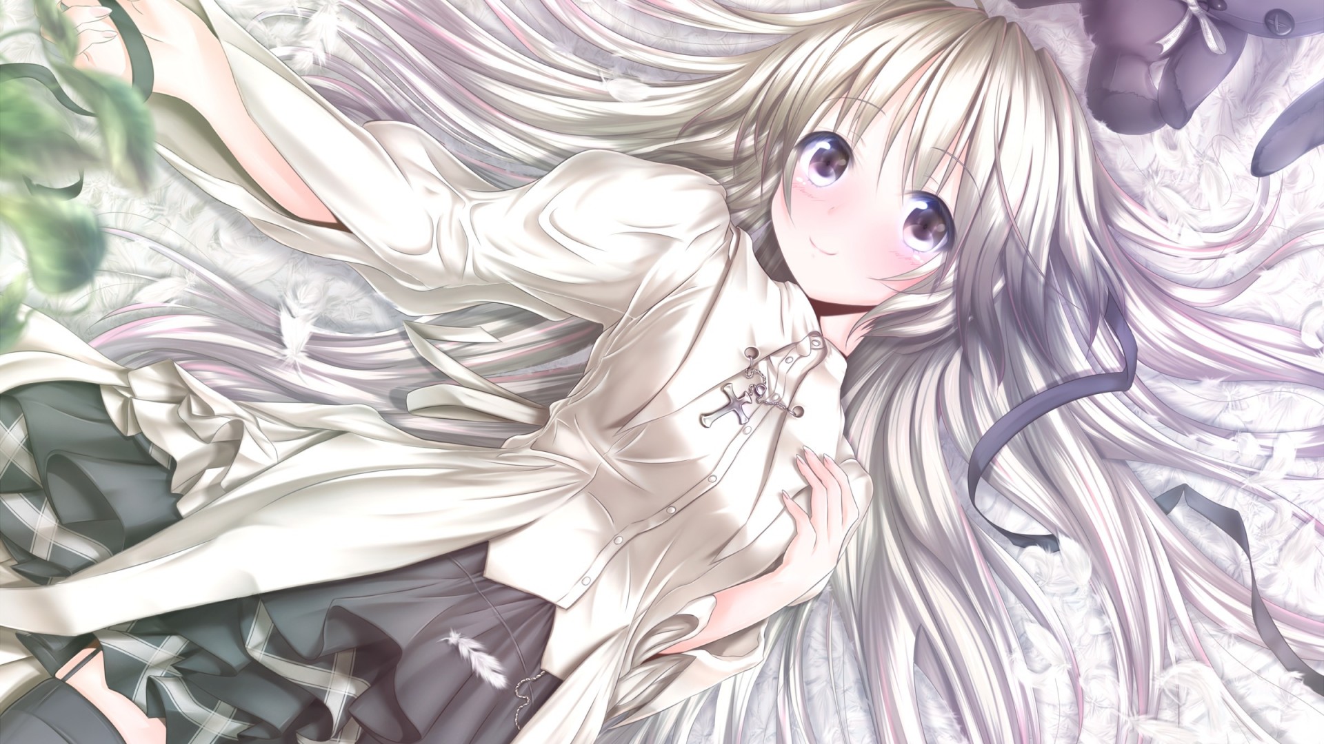 二次元动漫美女壁纸,躺在床上看书白衬衫美腿女孩免费电脑壁纸下载