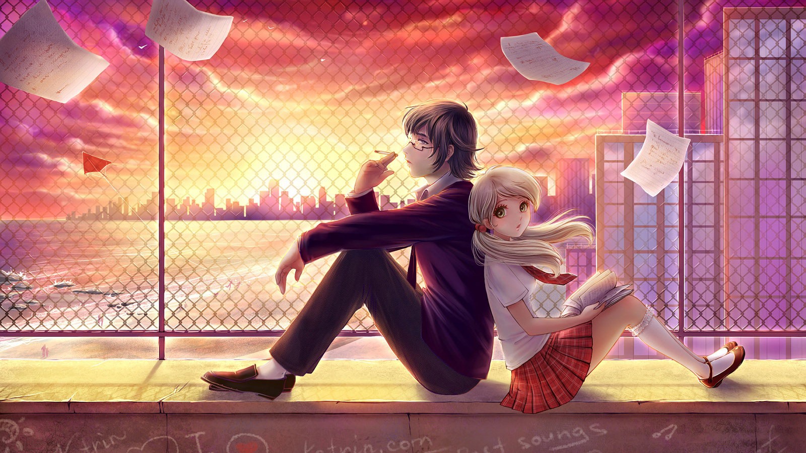 漂亮报纸墙少女黑白风格动漫裙子桌面壁纸免费下载