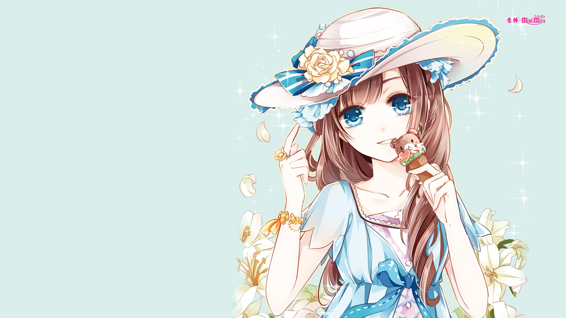 女孩与池塘水边花动漫美女免费电脑壁纸下载