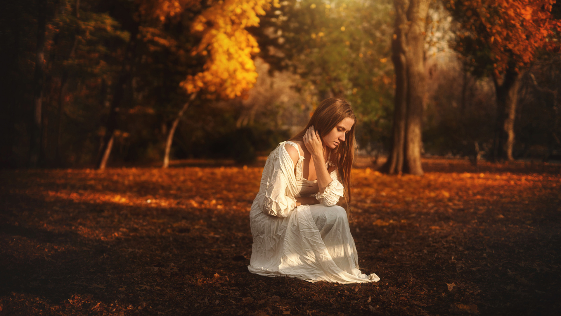 女孩秋天穿白色礼服裙子唯美电脑壁纸免费下载