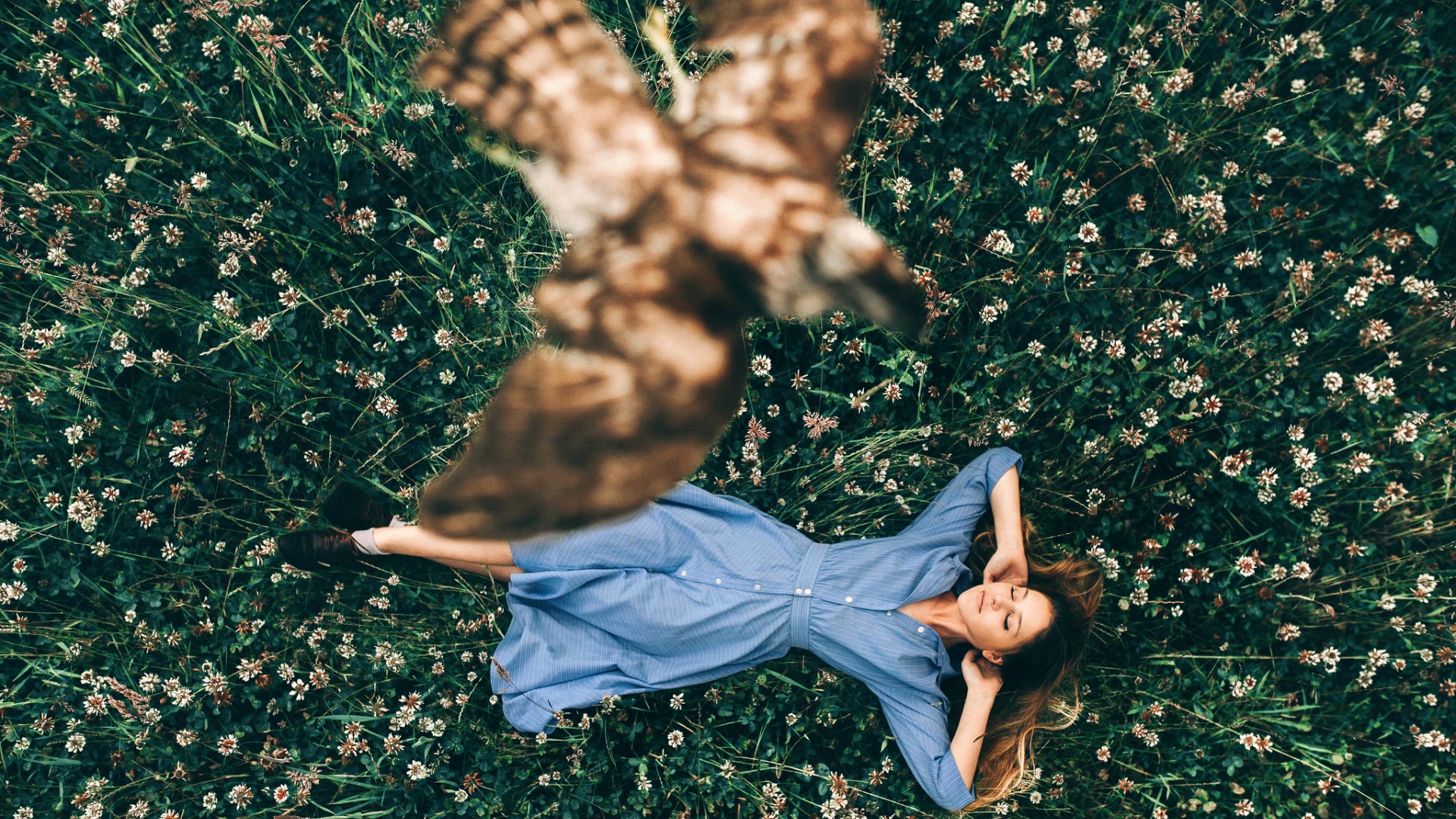 森林树木青苔环绕 穿白色长裙女孩睡觉唯美意境电脑壁纸免费下载
