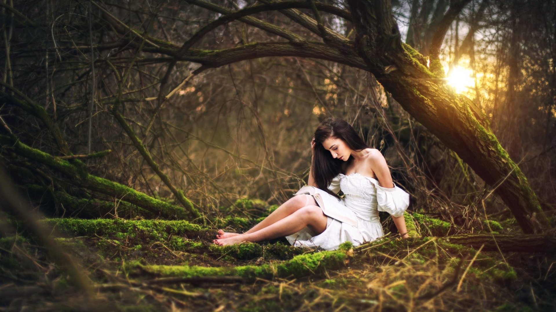 女孩树下白色婚纱鲜花花瓣唯美免费电脑壁纸下载
