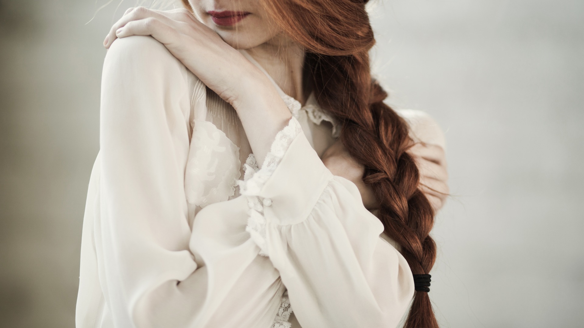 长腿棕色头发女孩与马在雾中围栏旁唯美电脑壁纸免费下载