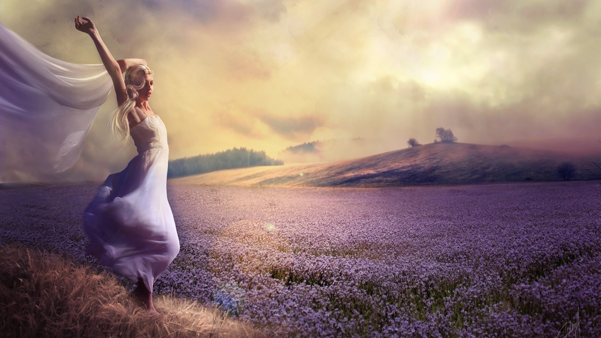 女孩夜森林穿白色礼服跑步唯美免费电脑壁纸下载