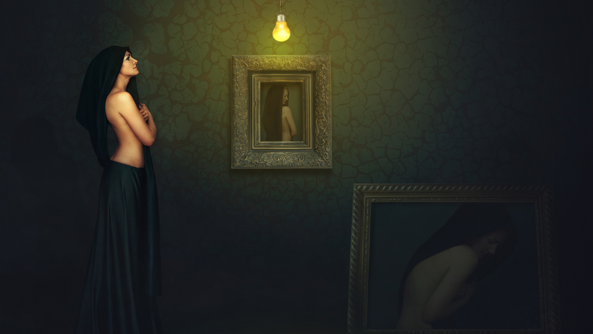 阁楼女孩头巾画框画灯唯美艺术电脑壁纸免费下载