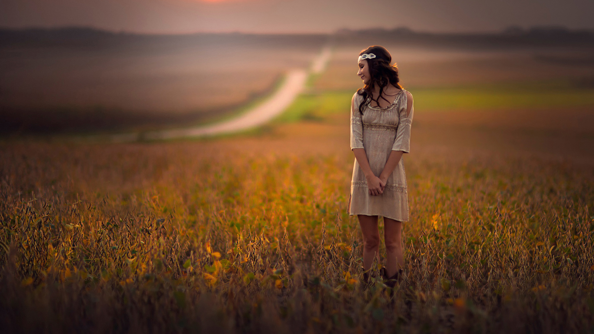 女孩白色裙子干草堆日落光线意境唯美免费电脑壁纸下载
