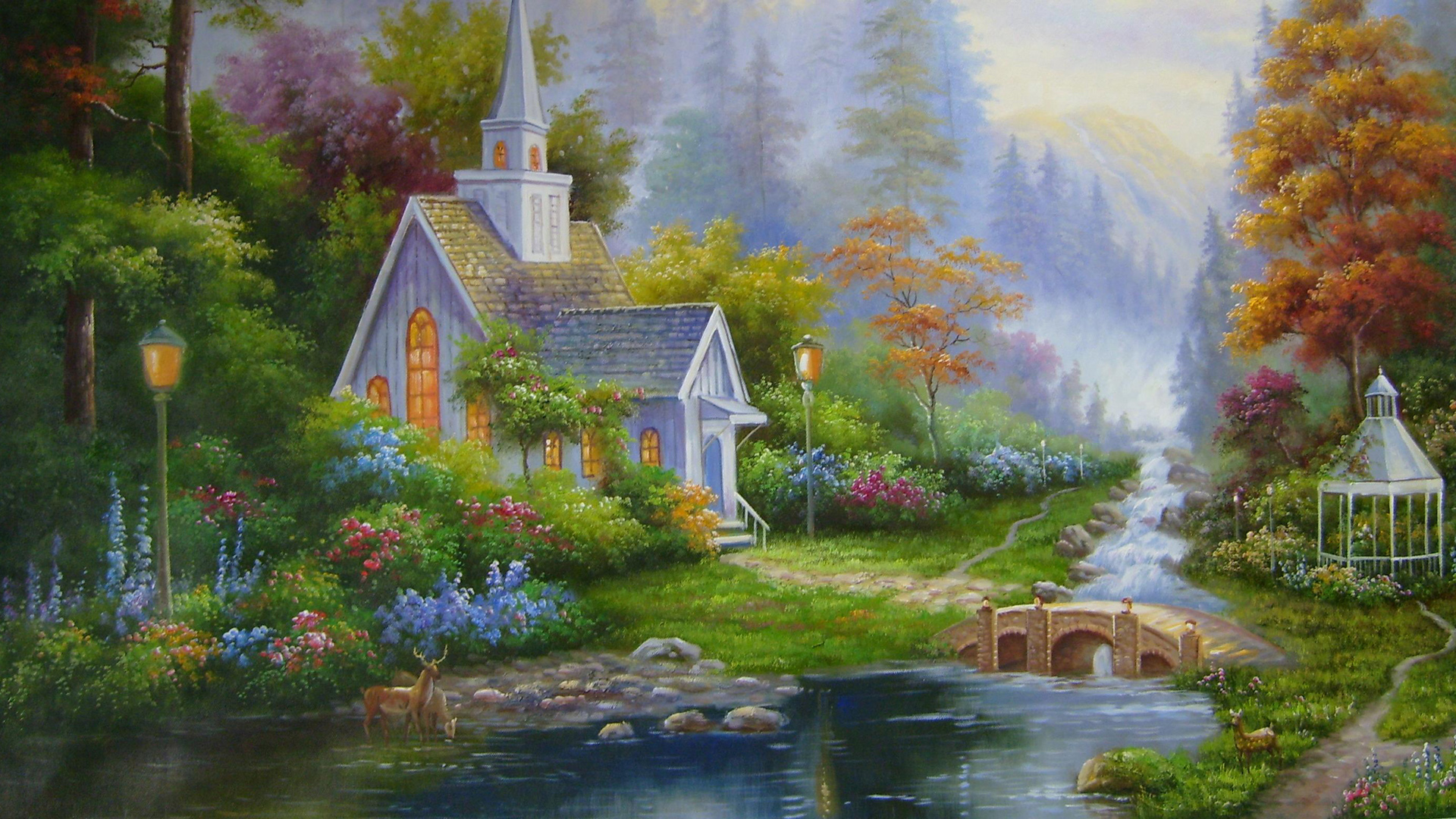 波斯白色小猫童话幻想风 屋顶房屋天空唯美免费电脑壁纸下载