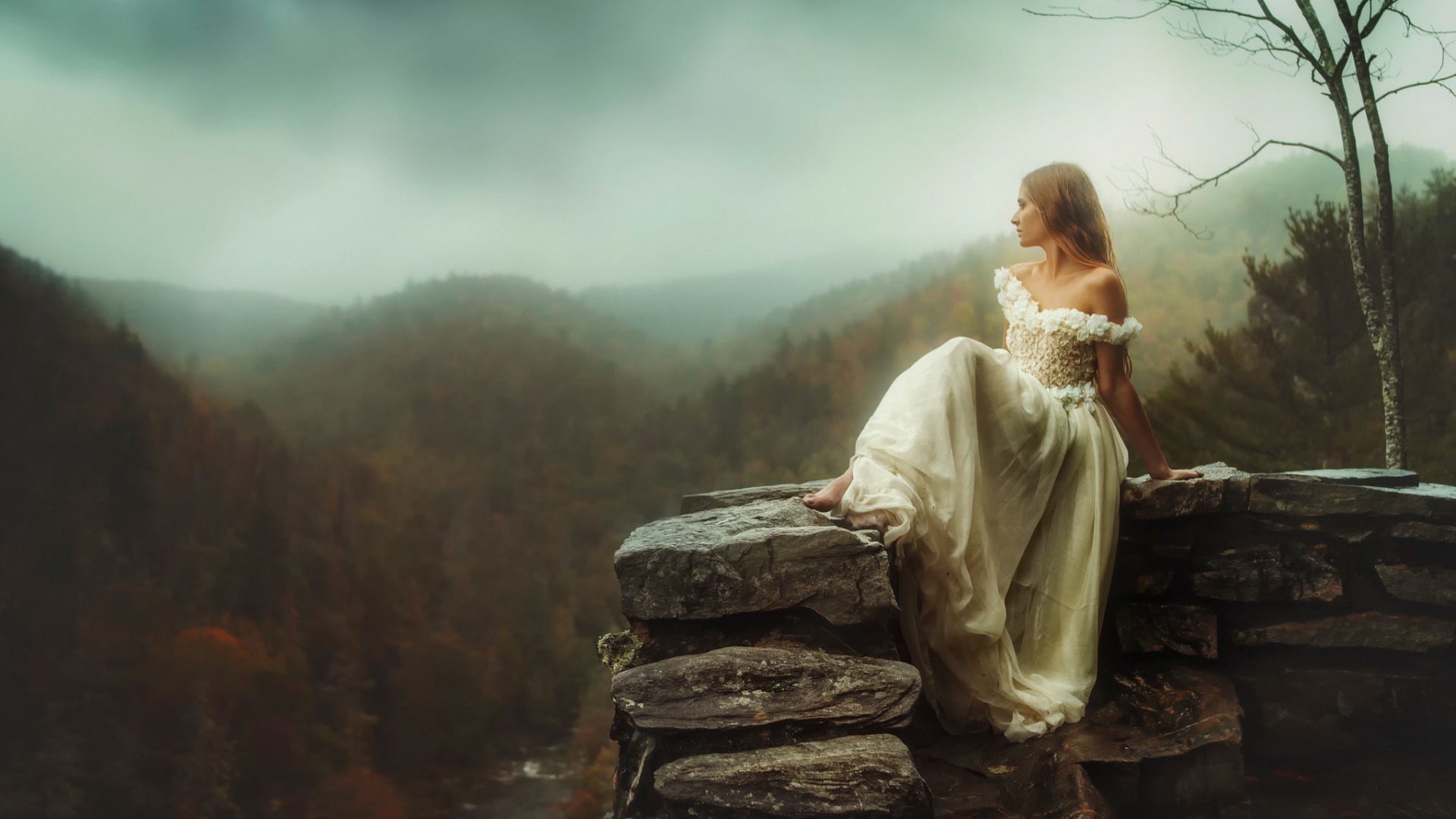 女孩白色裙子礼服与山区石头风景唯美免费电脑壁纸下载