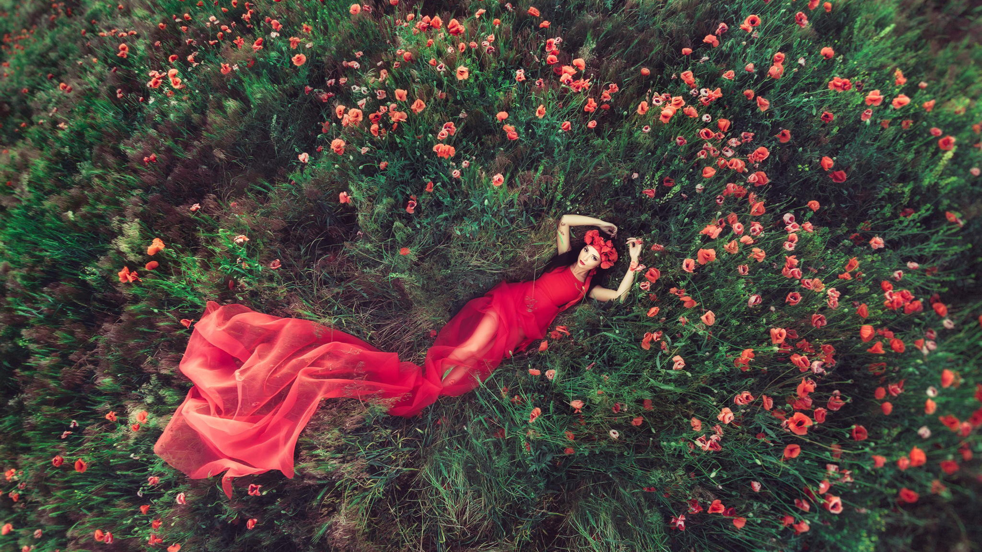 罂粟花 鲜花 花海 红色裙子礼服花环美女唯美桌面壁纸
