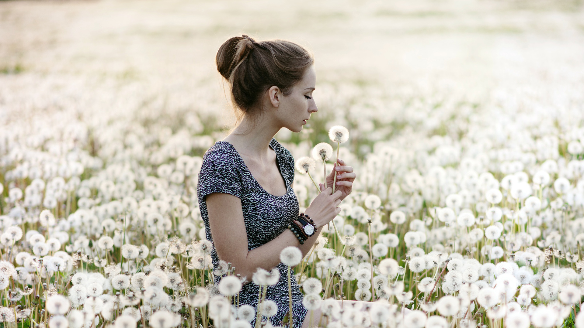夏天女孩与花场草地唯美电脑壁纸免费下载