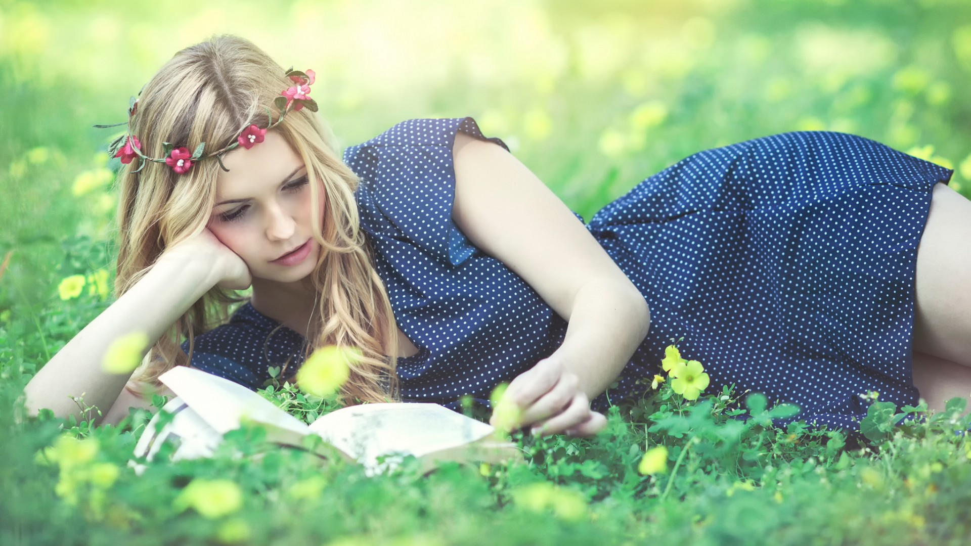 草地,美女,花圈,书,读书,礼服,唯美壁纸