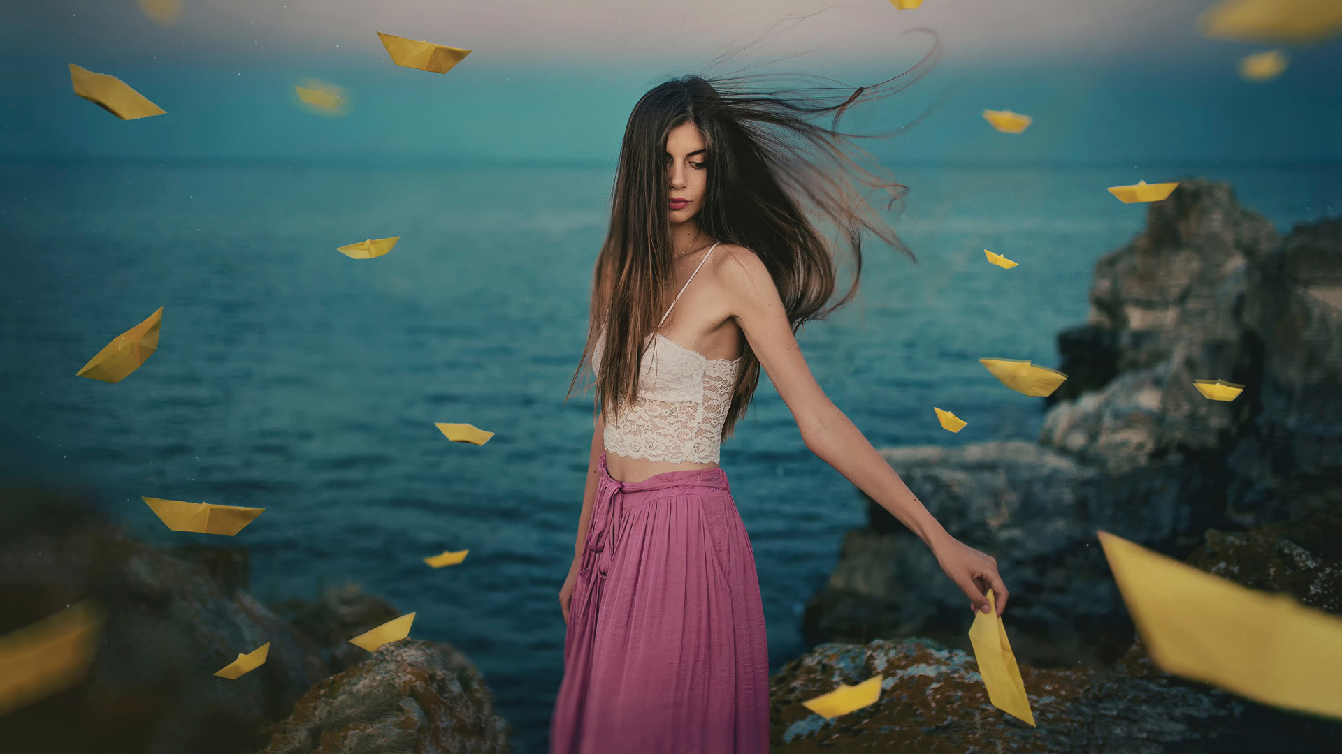 秋天叶子与女孩的唯美意境风景电脑壁纸免费下载