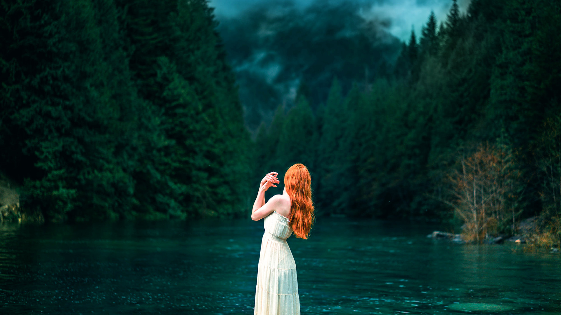 夏天户外树林长发白衣女孩唯美免费电脑壁纸下载