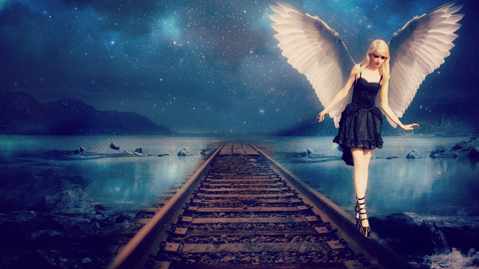 夏天清水河畔穿蓝色裙子女孩的唯美美女梦想风景免费电脑壁纸下载