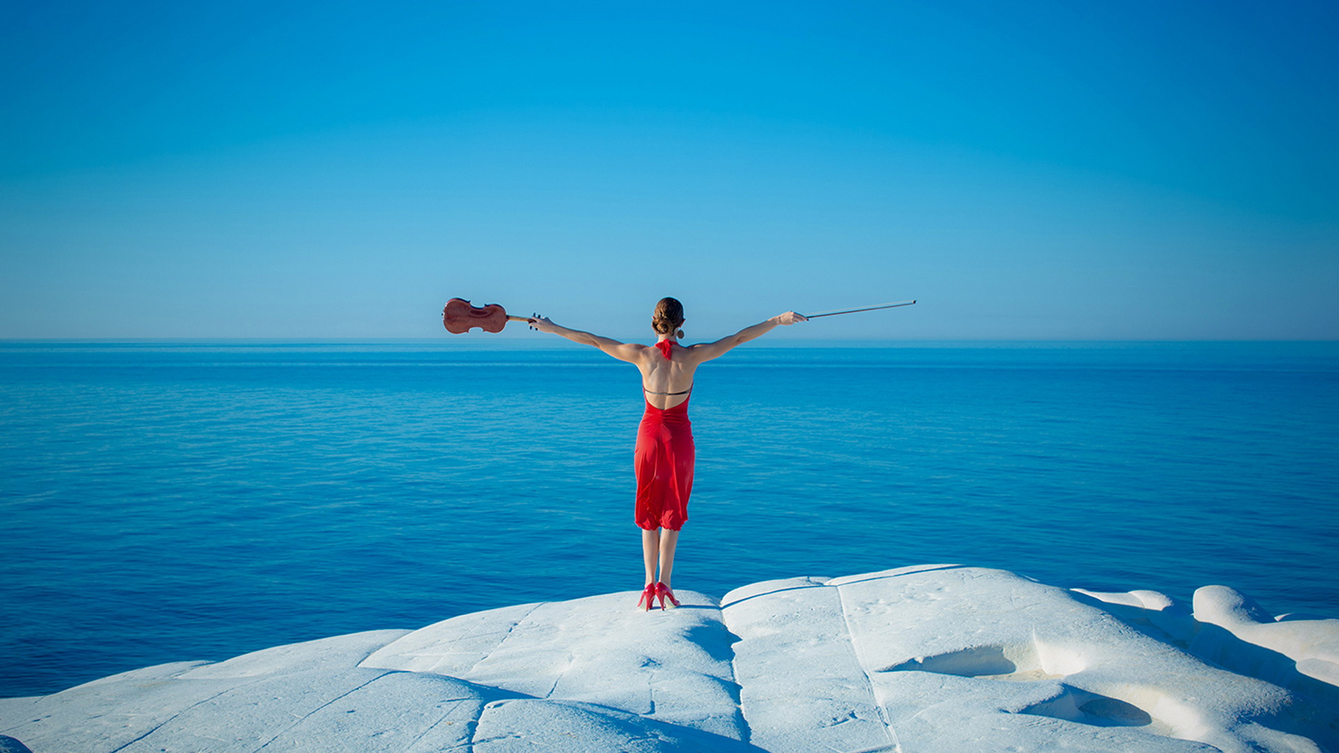天空山谷雾中冥想女孩唯美免费电脑桌面壁纸下载