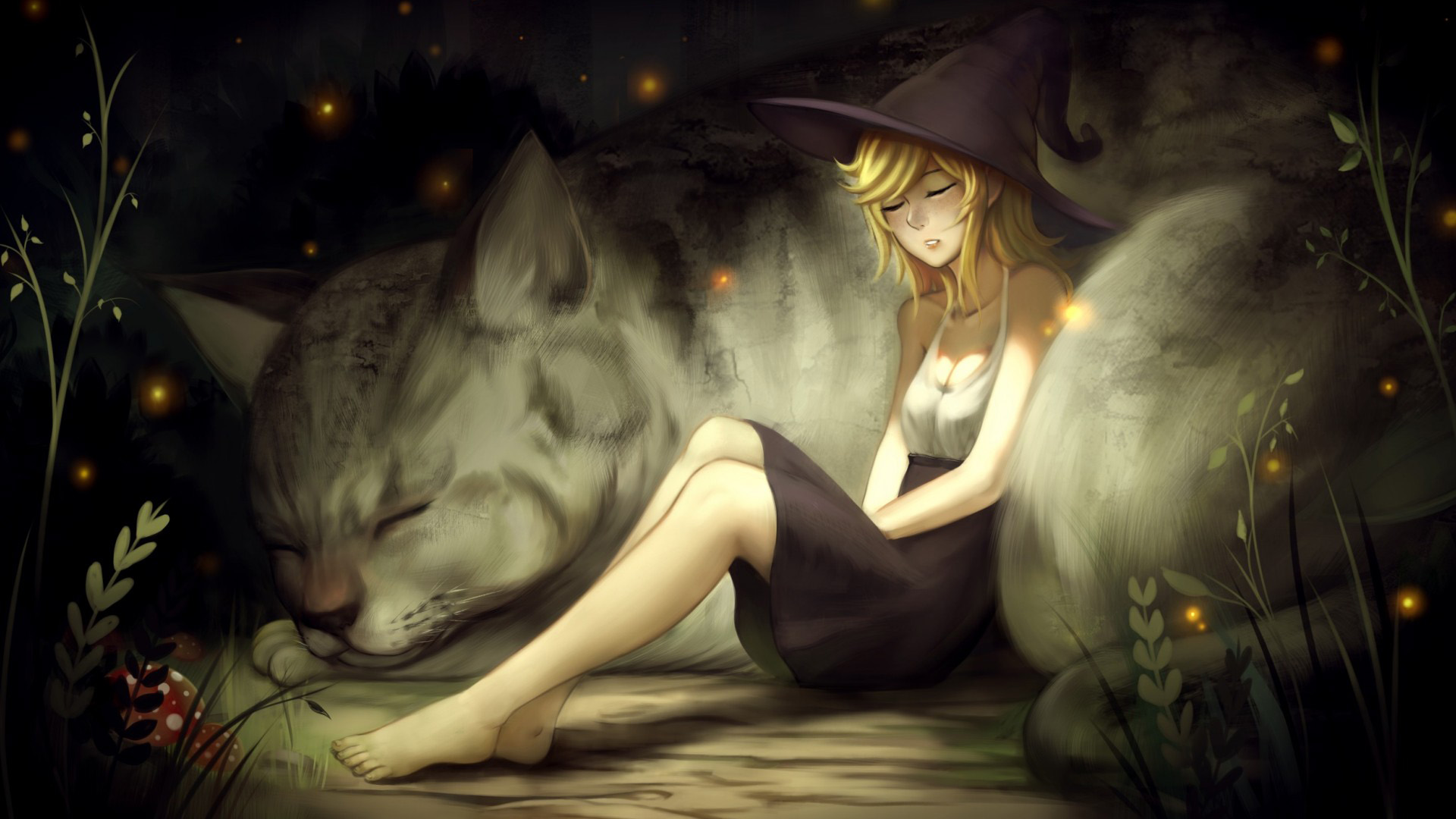 漂亮女孩穿白色礼服与狗自然照唯美免费电脑壁纸下载