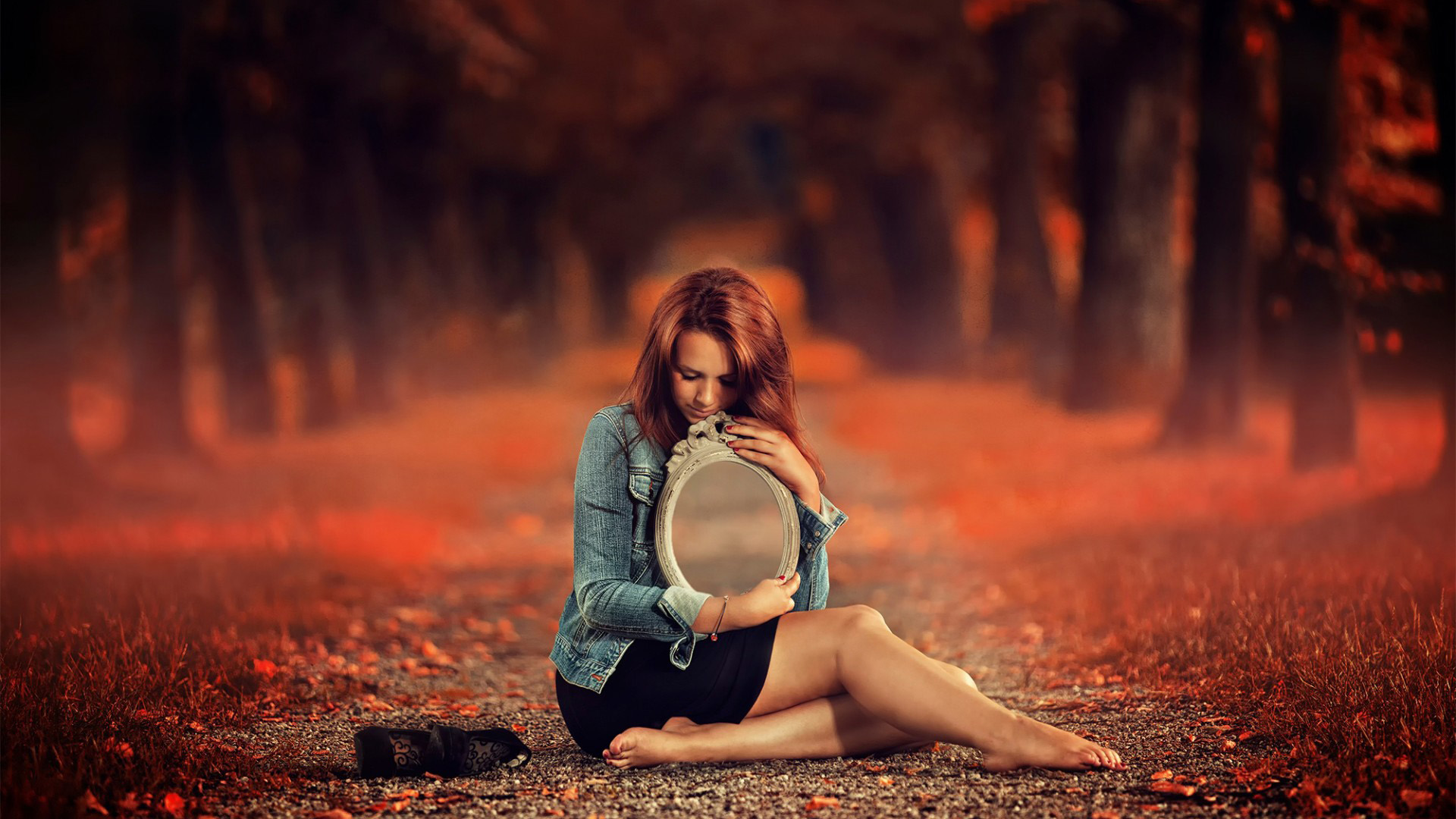 冬天雪中树林女孩冬装背影唯美免费电脑壁纸下载