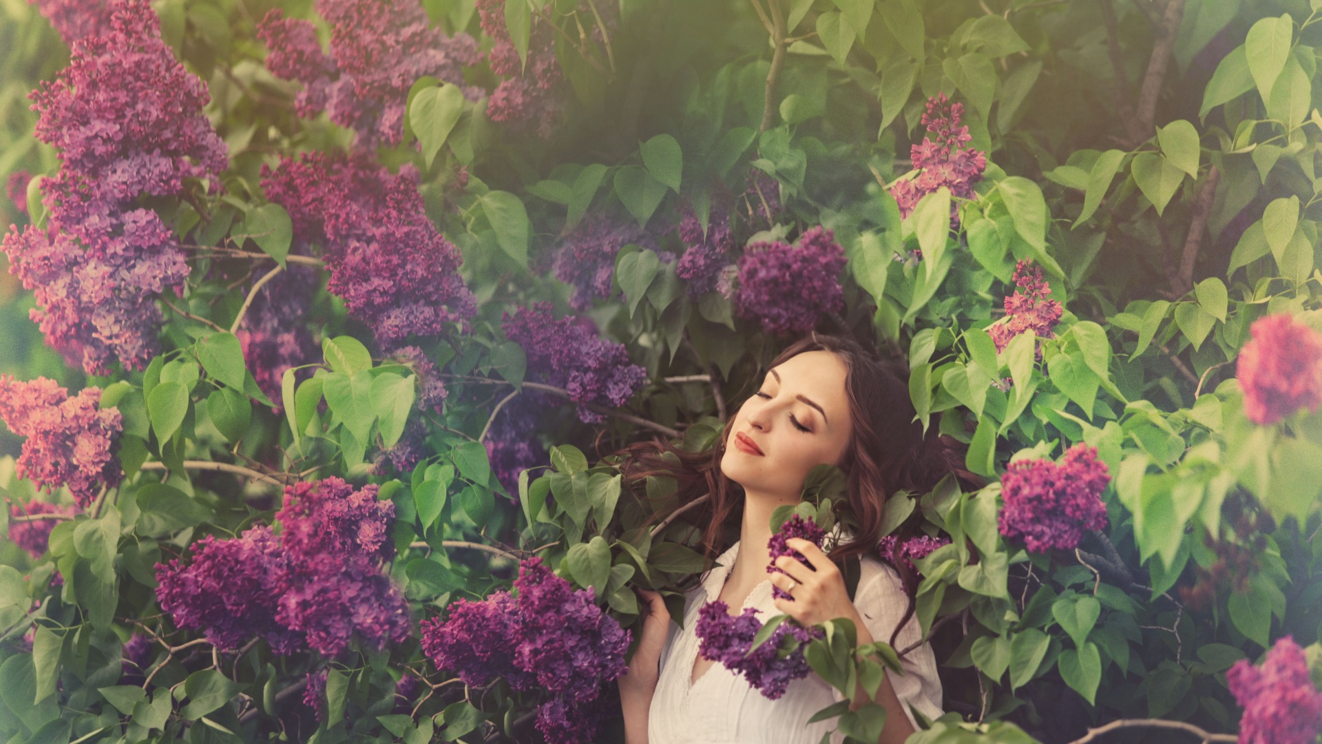 树木街道女孩背影配鲜花伞唯美电脑壁纸免费下载