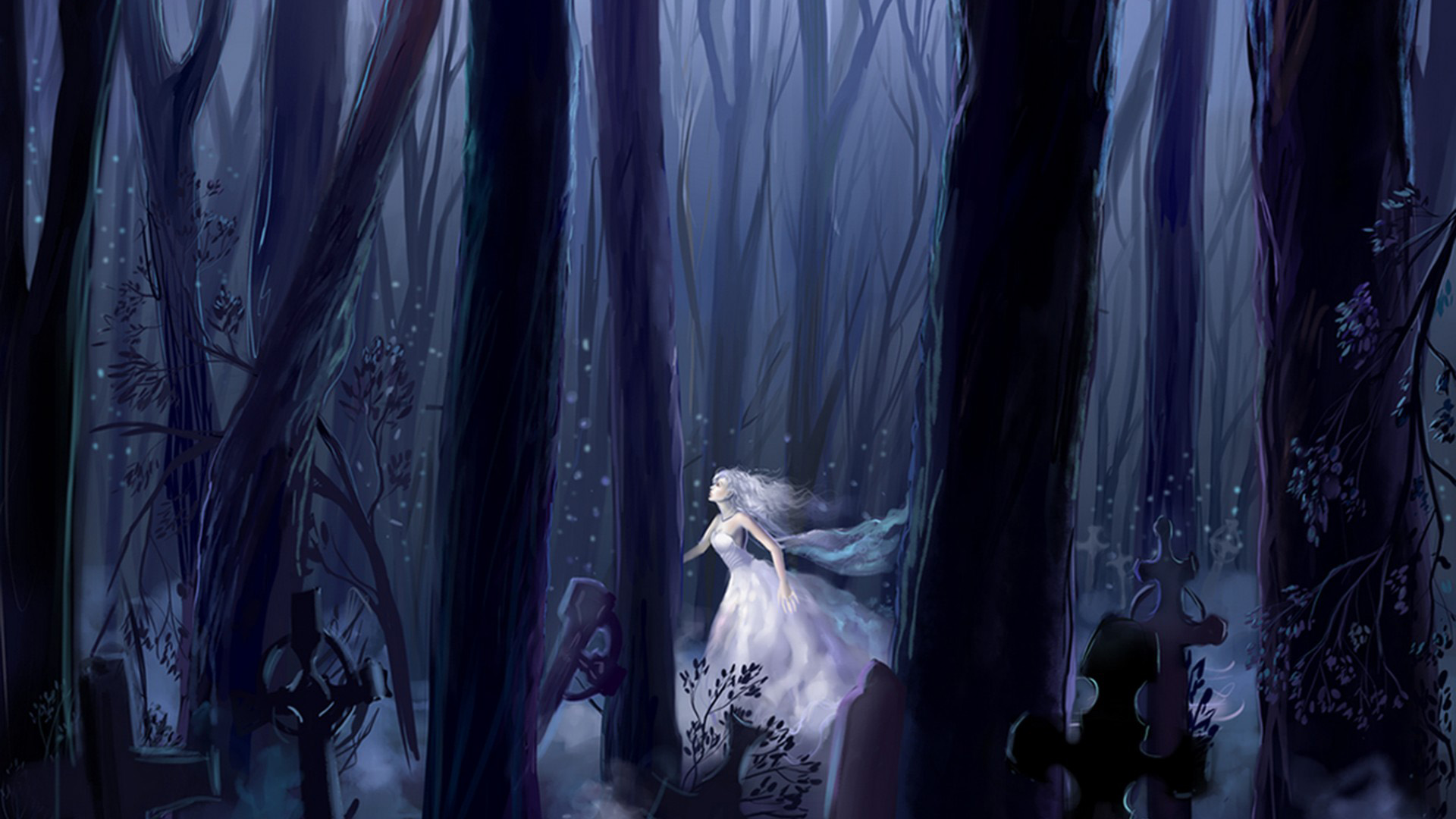 女孩夜森林穿白色礼服跑步唯美免费电脑壁纸下载