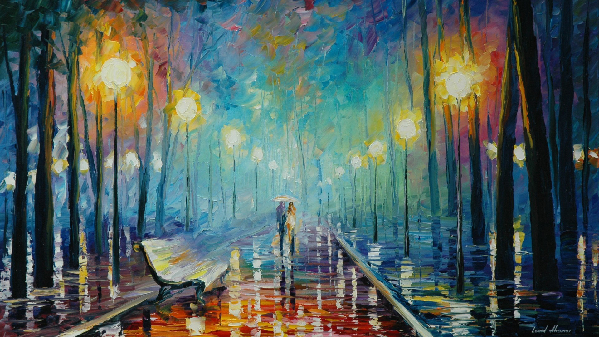 Leonid阿夫列莫夫绘画,公园雨中浪漫恋人撑伞唯美免费电脑壁纸下载