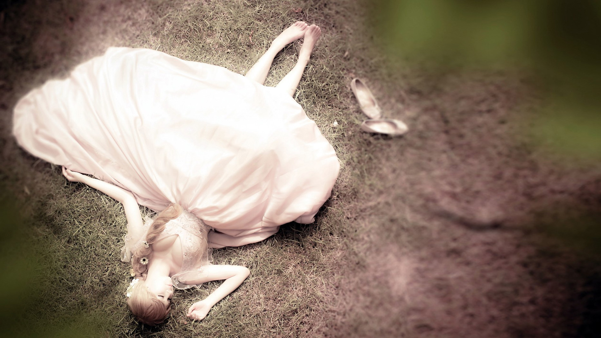 森林草丛植物与漂亮女孩穿蓝色裙子礼服唯美电脑壁纸免费下载