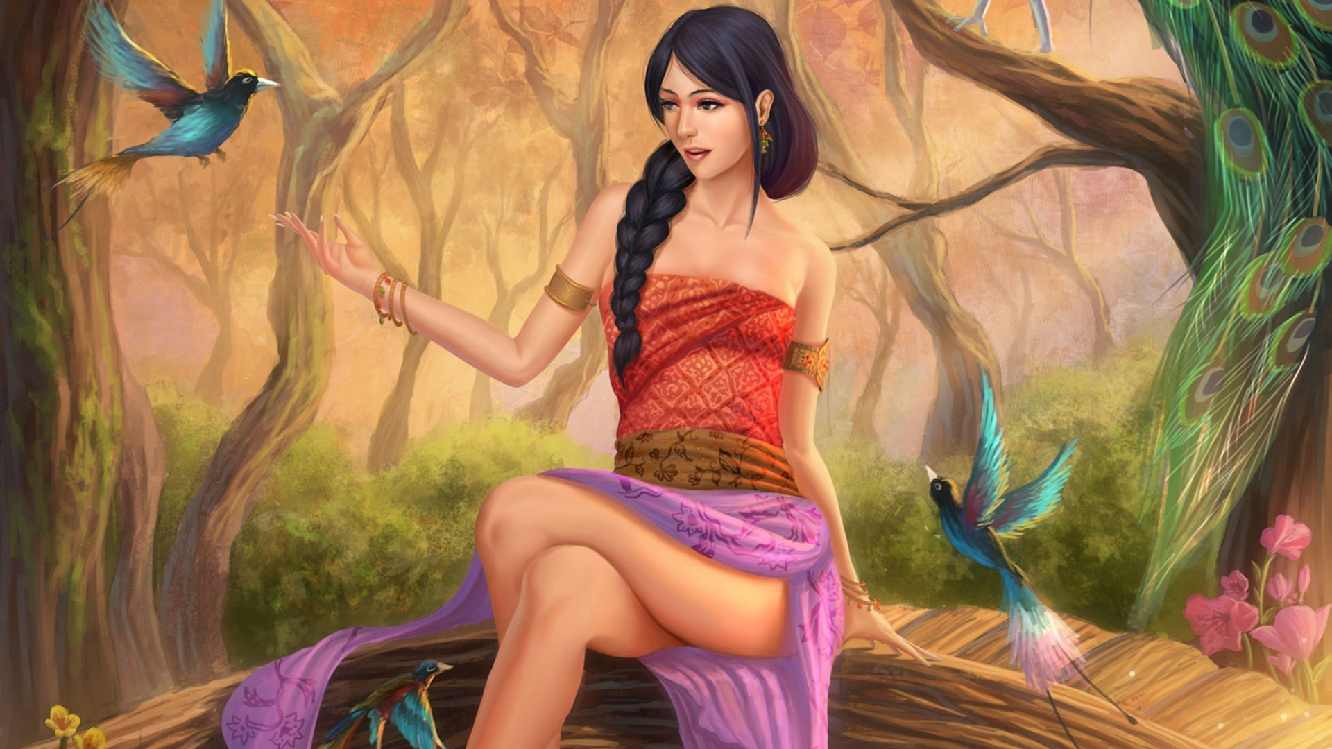 湖泊金鱼与女孩,唯美美女宽屏电脑壁纸免费下载