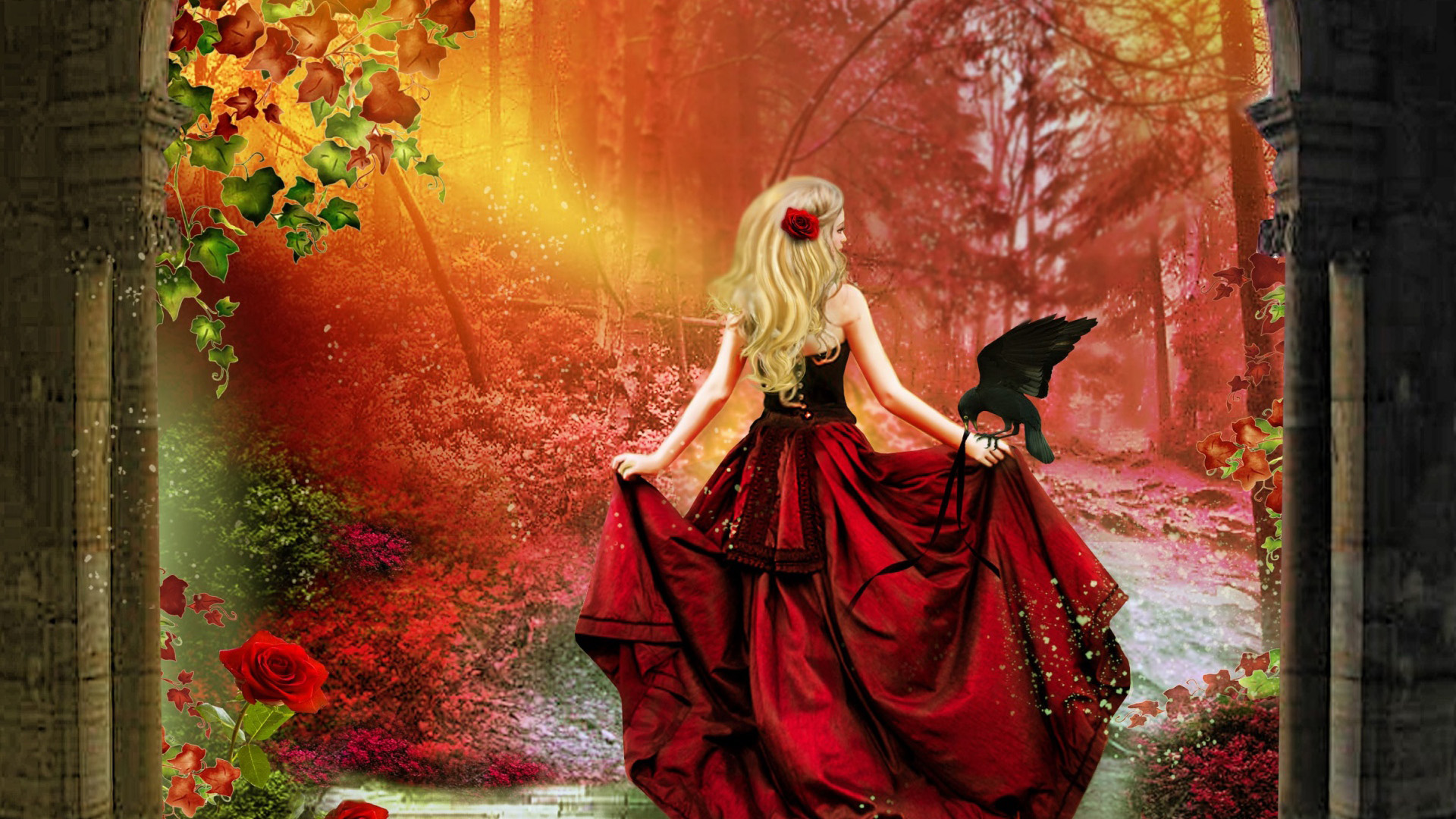 自然风景森林河流金发女孩裙装唯美免费电脑壁纸下载