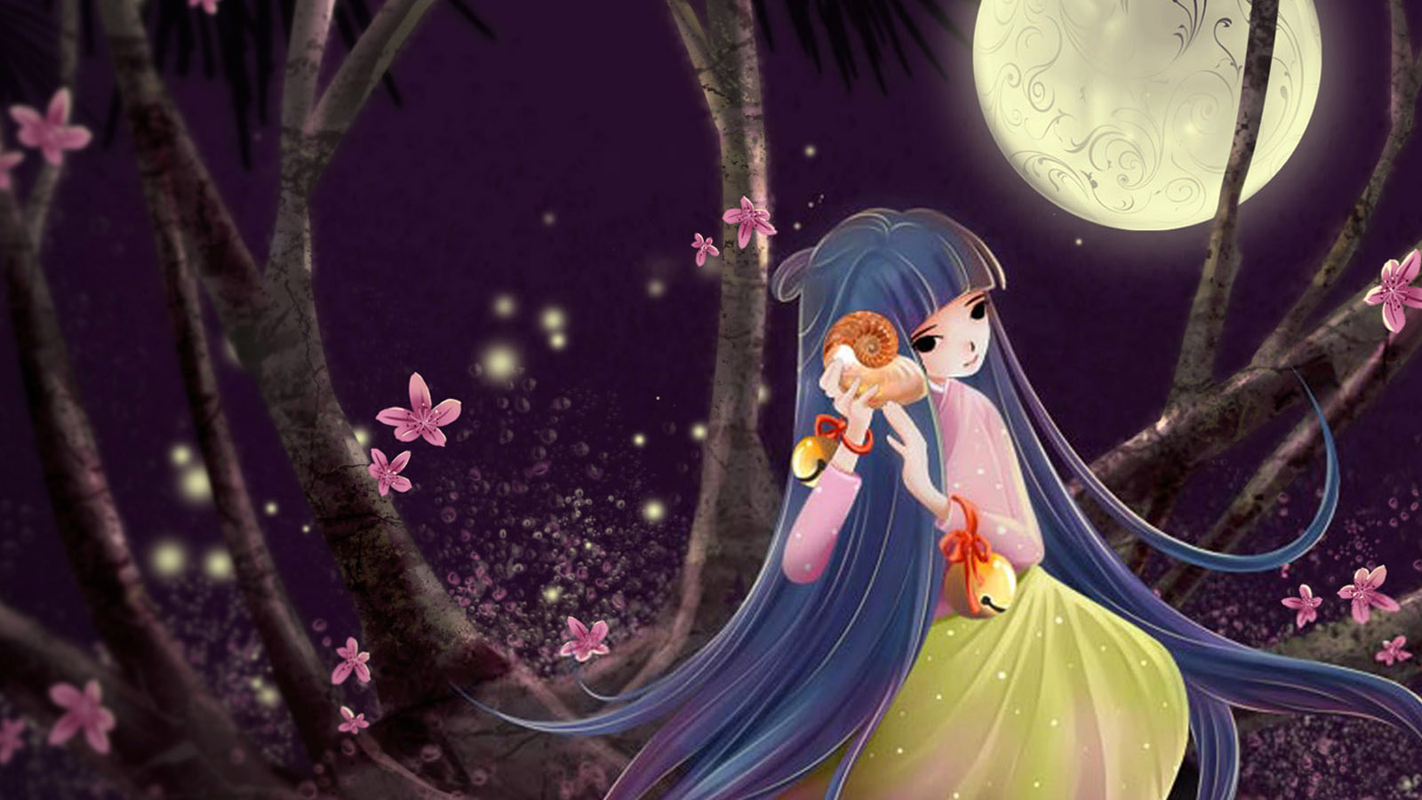 晚上月亮女孩星愿唯美免费电脑桌面壁纸下载
