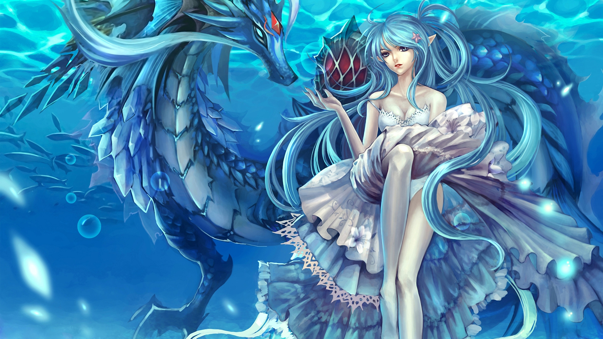 女孩,龙,精灵,海底,鱼,桌面壁纸