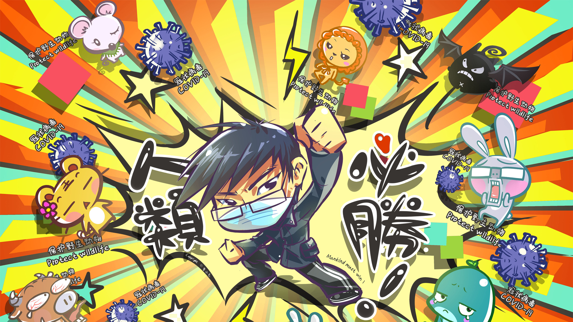 人类必胜保护野生动物战胜疫情手绘高清电脑壁纸免费下载