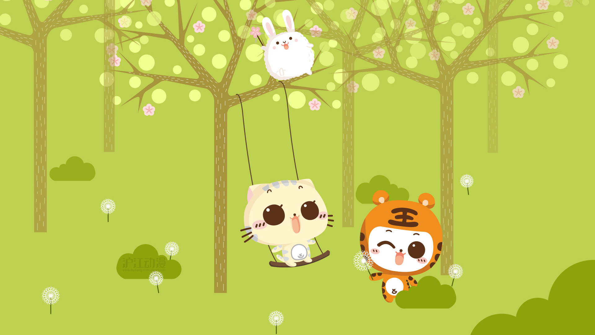 CC猫大脸吃货春天荡秋千可爱森林插画免费电脑桌面壁纸下载