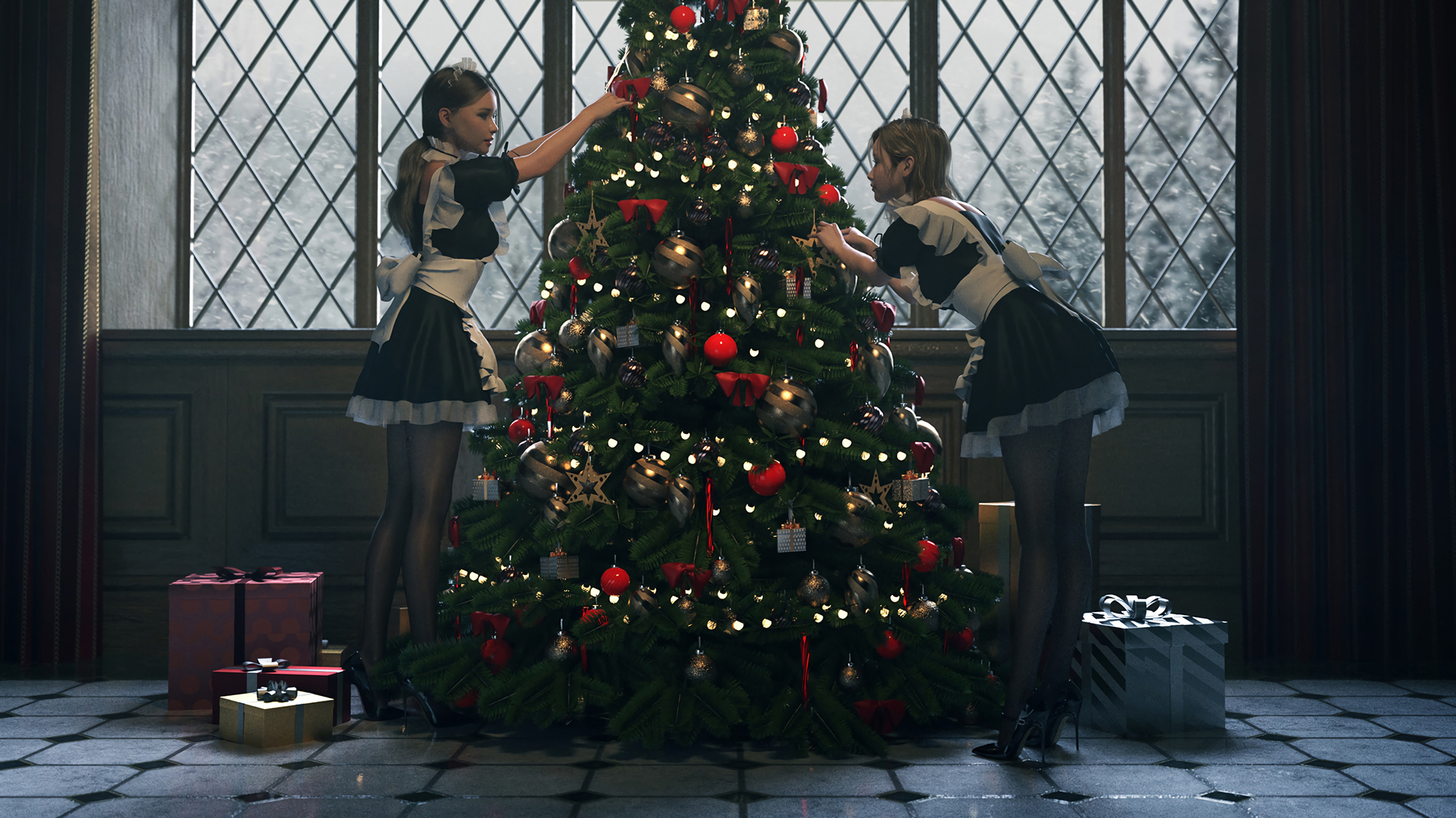 两个女仆黑色丝袜美腿布置圣诞树动漫免费电脑壁纸下载