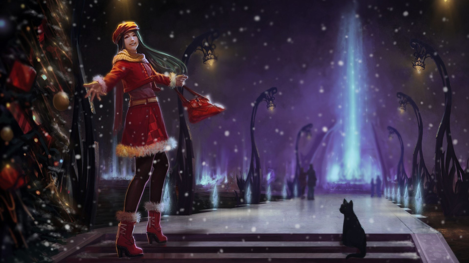冬天雪夜女孩与小黑猫可爱免费电脑壁纸下载