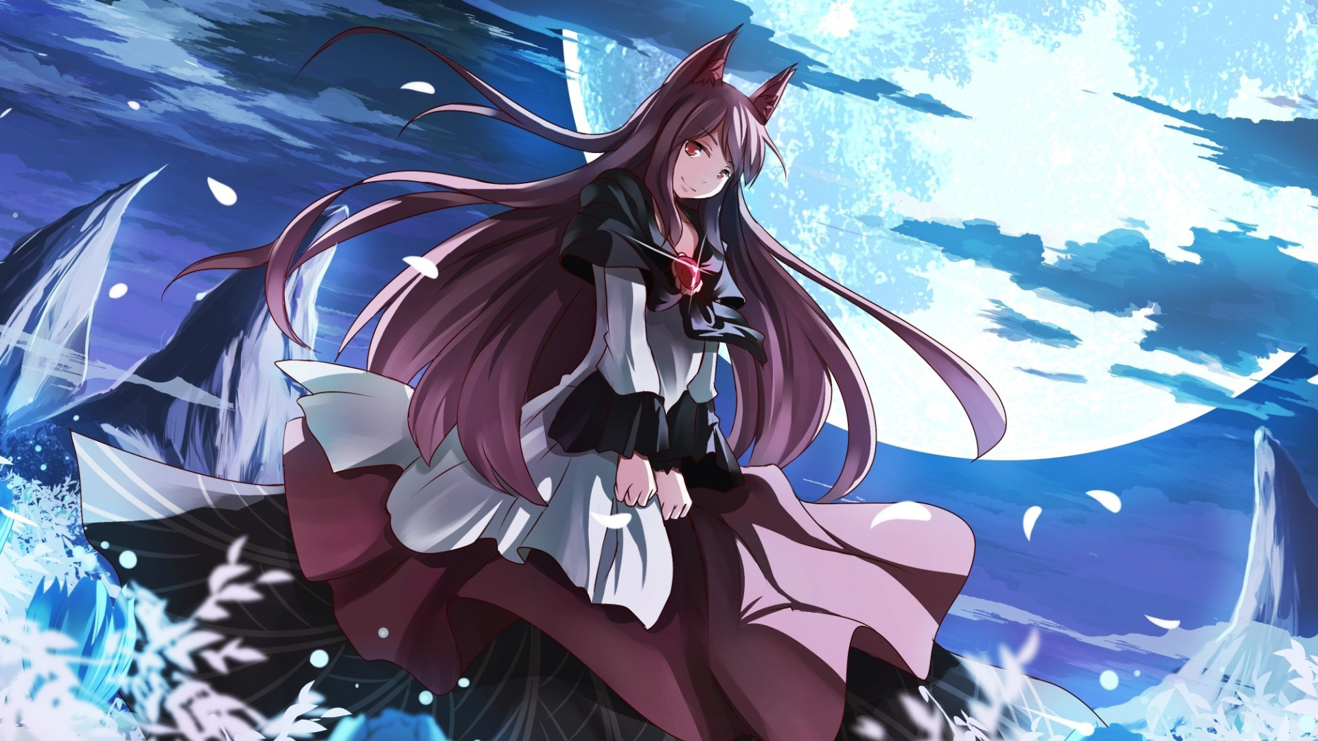 女孩和服持伞赏枫叶月亮唯美动漫电脑壁纸免费下载