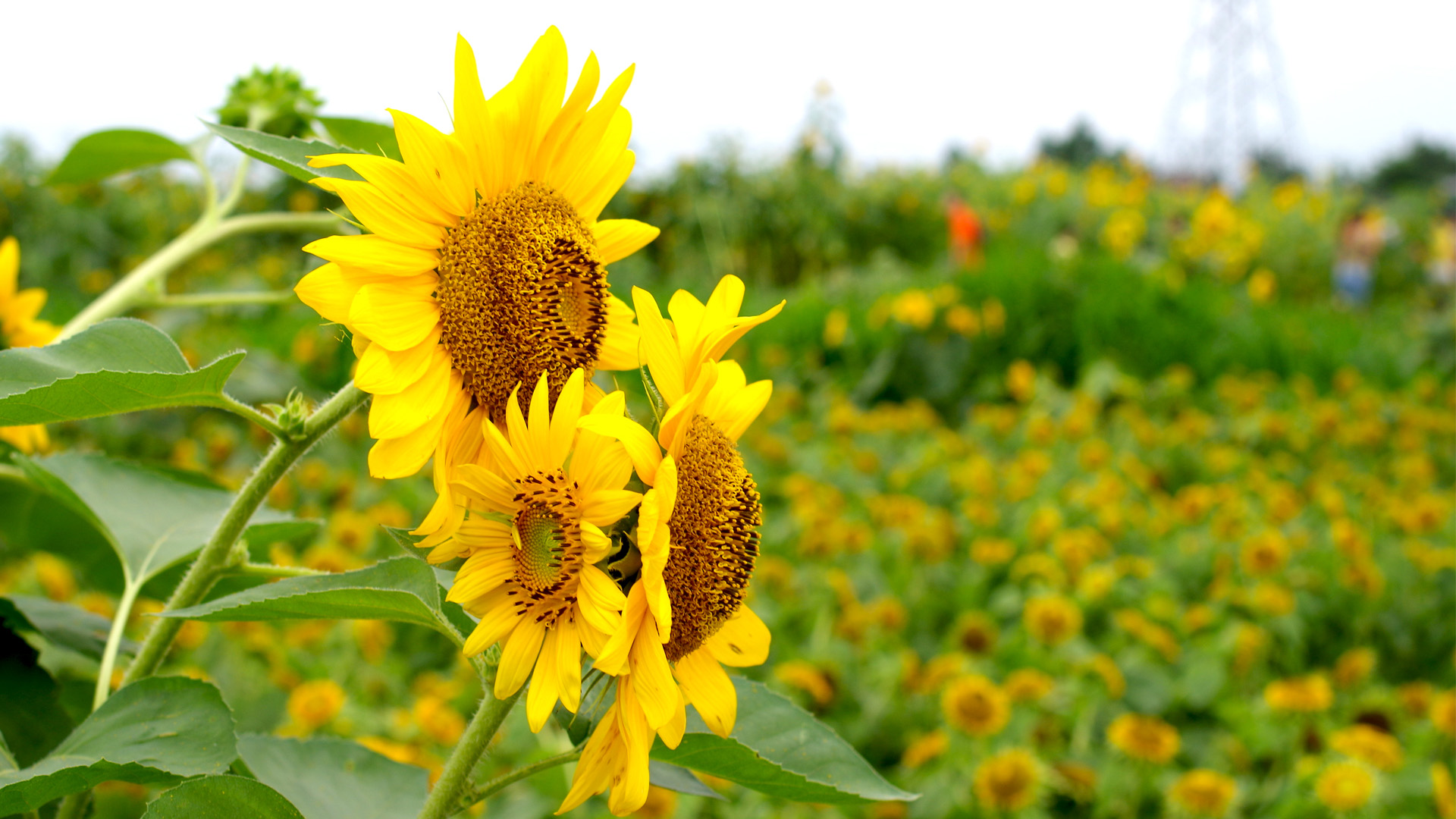 向日葵花卉桌面壁纸,花瓣叶子与天空的免费电脑壁纸下载