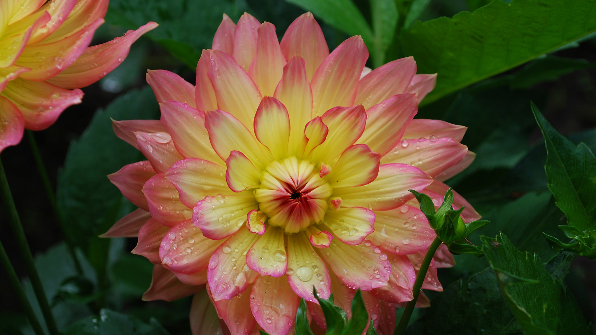 粉红色大丽花配绿叶桌面壁纸 免费电脑花卉壁纸下载