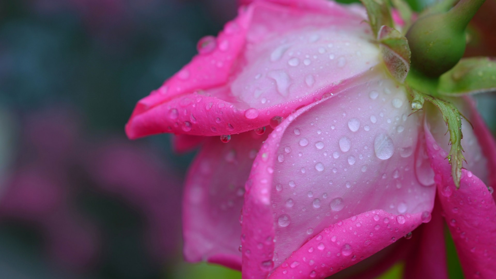 粉色花瓣玫瑰花蕾带露珠水滴绿色背景护眼花卉电脑壁纸免费下载