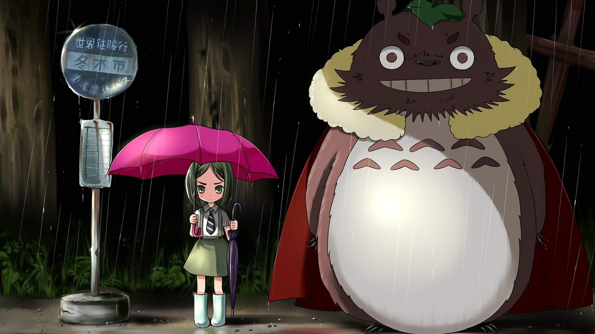 双马尾少女雨中夜景灯光动漫壁纸 免费电脑桌面下载